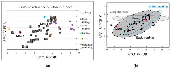 Isotopic signature of “Black”, dark grey samples (MAN4 and MAN7), from Valdetorres de Jarama in two isotopic diagrams, in the red symbol; (a) isotopic diagram of data of two different quarries of black samples and some important archaeological pieces to compare [,,]; (b) the general isotopic diagram for Göktepe quarries with black dots for the black Göktepe ([] and references therein).