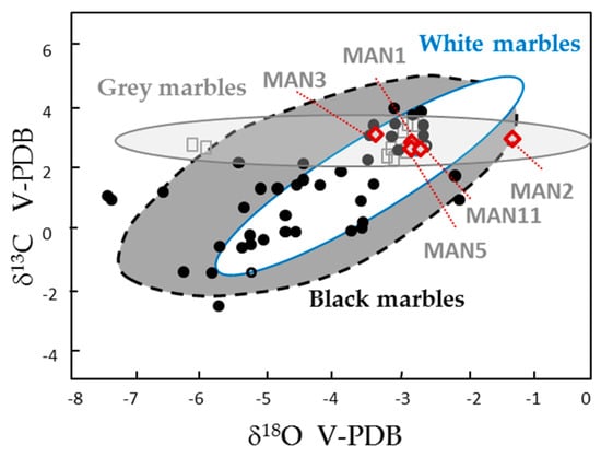 Isotopic signature of light grey samples in the red symbol (MAN1, MAN2, MAN3, MAN5, and MA11) from Valdetorres de Jarama in the general isotopic diagram for Göktepe quarry marbles with grey square symbol for grey Göktepe [,,].