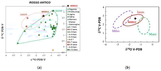 Isotopic signature of the red marble under study (MAN12). (a) The diagram for Iasos and Mani quarry red marbles and twelve archaeological artifacts (A-1 to A-12) from the literature []; (b) the isotopic diagram proposed in [] which includes both Carian red from Milas and Iasos.