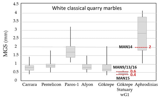 Maximum grain size (dashed red line) of the white sculptural marbles studied from the Valdetorres de Jarama collection fine-grained (samples 9, 13, and 16) and extremely fine-grained marbles (sample 15) are compared to the MGS of the most important fine-grained marbles of statuary quality. Both types are associated to the wG1 statuary white Göktepe. Medium-to-coarse-grained marble (sample 14) is discussed in Section 3.4.2.