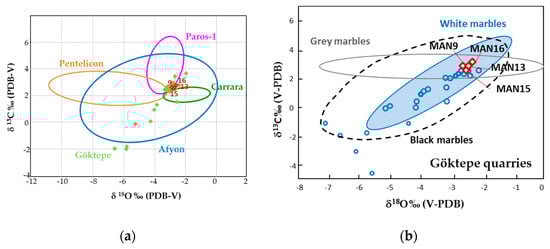 Isotopic signature of the archaeological samples (in red) of fine-grained white marbles plotted on two different isotopic diagrams; (a) isotopic diagram with the 90% probability ellipses of the most important classical marbles [] with the data points of white Göktepe quarry marbles []; (b) scatterplot of the C and O isotopic values of the white Göktepe quarry marble with its 90% probability ellipse (in blue) adapted from [] and papers therein.