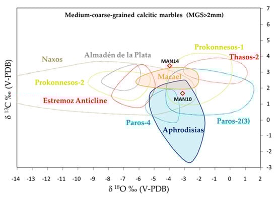 Concerning C and O isotopes, both varieties are plotted in the isotopic diagram for medium-coarse-grained pure calcite marbles which includes the most important ones used in classical antiquity in the Eastern Mediterranean territories [], and those of Estremoz Anticline, Almadén de la Plata, and Macael district in Iberia [,] (Figure 9). In this diagram, the isotopic signature of sample 14 falls outside any of the isotopic fields of the most important coarse-grained classical marbles. In this respect, two issues must be pointed out. On the one hand, it cannot be related to any of the projected Hispanic marbles (despite its isotopic proximity to those of Macael, since neither petrographic nor its CL characteristics are comparable with this Hispanic marble). On the other hand, it should be noted that the isotopic field indicated as representative of the marble from the quarries of the city of Aphrodisias has received the attention of various studies in the last twenty years, so the number of samples analysed has led to expanding its field towards higher values of δ13C in the most recent proposals [,,].