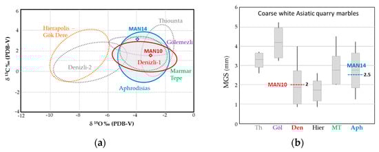 Analytical diagrams referring to Anatolian quarries with medium-coarse-grained white marbles (Caria and Phrygia regions): Th (Thiounta), Göl (Gölemezli), Den (Denizli), Hier (Hierapolis-Gök Dere), MT (Marmar Tepe), and Aph (Aphrodisias). (a) isotopic diagram; (b) grain size diagram (MGS) [,,].
