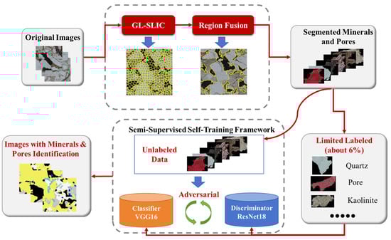 Workflow for recognizing minerals using GL-SLIC segmentation and semi-supervised training.