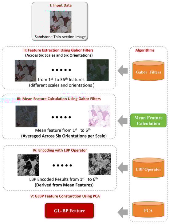 This section introduces a novel texture feature extraction algorithm that integrates the local binary pattern (LBP) operator with Gabor filters, leveraging both spatial and frequency domain characteristics, as shown in Figure 3. This hybrid approach robustly extracts features from sandstone thin section images, effectively minimizing the impact of external factors such as noise, illumination, rotation, and shadows.
