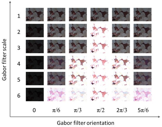 2. Feature Extraction Using Gabor Filters: The algorithm applies Gabor filters at various scales and orientations to the original sandstone thin section images. Specifically, the filters are set at six different scales and six orientations, creating a total of 36 distinct Gabor filters. These filters systematically extract features across the images, resulting in 36 Gabor feature vectors. Figure 4 illustrates the features extracted by the Gabor filters at each scale and orientation. The scales are shown vertically from top to bottom (1 through 6), and the orientations are displayed horizontally.