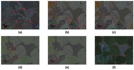 Figure 5 visually demonstrates the effectiveness of Gabor filter transformations in extracting distinctive textural features from sandstone thin sections at various scales and orientations. Each panel within the figure highlights the nuanced differences between quartz grains and other geological components, which are not easily discernible in the original images. In panels such as Figure 5a,b, red boxes identify two quartz grains that appear similar in the raw image but are distinctly separated in the processed images due to the enhanced textural contrasts provided by the Gabor features. Similarly, Figure 5d,f use red and blue boxes to differentiate between quartz and pores with enhanced clarity. This shows that even subtle textural differences become pronounced when viewed through Gabor-filtered images. The distinct representation of quartz in Figure 5f, where its color appears markedly darker than surrounding materials, exemplifies how effectively these features can isolate specific components.