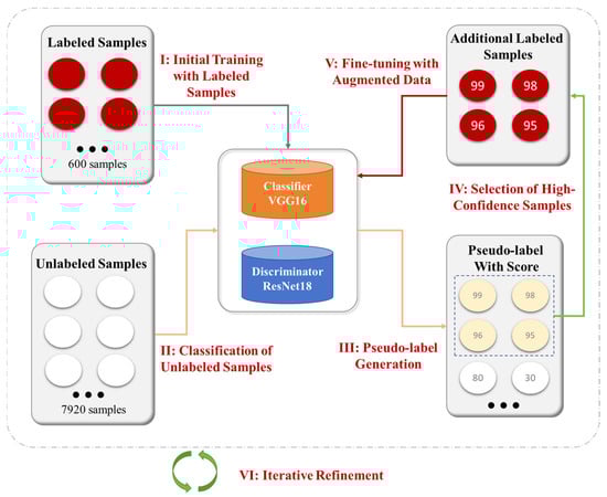 This section introduces a semi-supervised self-training model for classifying petrographic thin section images, as shown in Figure 7. This model emphasizes pseudo-labeling to augment the training dataset effectively. The process is iterative and refines classification accuracy through repeated training cycles. Here are the detailed steps:
