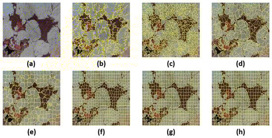 Comparison of superpixel segmentation algorithms on sandstone images: (a) original sandstone image; (b) FH; (c) QS; (d) SEEDS; (e) Watershed; (f) LSC; (g) SLIC; (h) GL-SLIC.