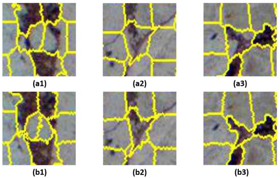 Detailed comparison between SLIC and GL-SLIC algorithms: (a1) detail area a1 from SLIC; (a2) detail area a2 from SLIC; (a3) detail area a3 from SLIC; (b1) detail area b1 from GL-SLIC; (b2) detail area b2 from GL-SLIC; (b3) detail area b3 from GL-SLIC.