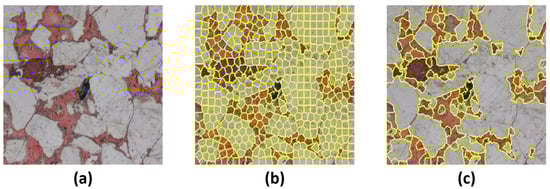 Comparison of superpixel merging in medium-coarse-grained quartz sandstone: (a) medium-coarse-grained quartz sandstone image; (b) pre-segmentation result; (c) result after superpixel merging.