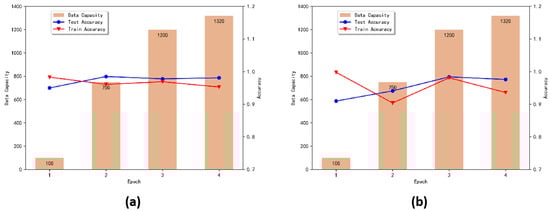 Figure 14 showcases the initial use of manually labeled data to prime both the primary and discriminator models. After initialization, both models exhibit testing accuracies above 90% but quickly encounter issues with overfitting. To address this, unlabeled monolithic rock data are introduced into both models to generate high-confidence data, enhancing the training dataset. By the second iteration, when the dataset size reaches 750 images, both models maintain accuracies above 90%, with overfitting issues significantly mitigated. At this stage, the classification models already show promising results. However, the monolithic rock dataset includes data beyond the manually labeled five categories, labeled as “other.” To appropriately classify this additional category, model iterations continue until the termination criteria are met. Subsequently, high-quality data from the remaining unlabeled monolithic rock data are selected as the “other” category.
