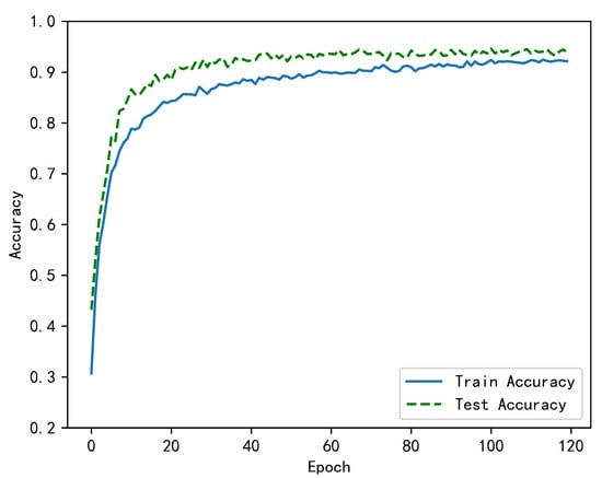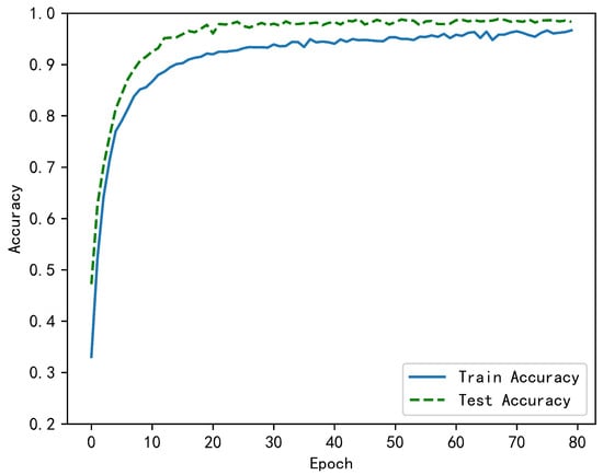 To address the imbalance caused by the necessary removal of data wrongly included in the “other” category—which would reduce its volume by nearly 44%—image rotation methods are employed to enhance and balance the dataset. After cleansing and enhancing the dataset, the model converges by the 80th iteration with significantly improved accuracies: 93.7% for training and 96.3% for testing, the results are shown in Figure 17.