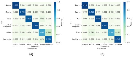To provide a detailed evaluation of the model’s performance and pinpoint the specific rock components that are problematic, confusion matrices for both the training and testing datasets are utilized, thereby illustrating the classification accuracies across all six rock types. This approach allows for a nuanced analysis of the model’s strengths and weaknesses in distinguishing between the different categories of rock components. Figure 16 shows the confusion matrices for the training and validation sets. It can be seen that, except for the “other” category, the accuracy for each class is relatively high, with an average accuracy of around 95%. However, when data from the “other” category are incorporated, the accuracy notably decreases to around 90%. This drop is primarily attributed to the inherent characteristics of the “other” category, which lacks distinctive features compared to the well-defined categories of quartz, pores, rock fragments, matrix, and kaolinite. Due to the ambiguous nature of this category, the model struggles to discern clear patterns within the 100 manually labeled samples of the “other” category, leading to a less precise learning outcome.