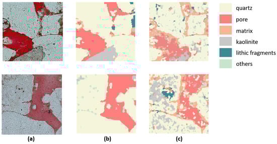 Component identification results: (a) original petrographic thin section images; (b) proposed method results; (c) UNet-based semantic segmentation results.