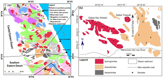 (a) Geological map of the central Eastern Desert of Egypt exhibiting the distribution of granitoids and other rock units of the basement rocks adjacent to the studied area (modified after [10]). (b) Geological map of Mount Abu Kibash and Tulayah in the central Eastern Desert of Egypt.