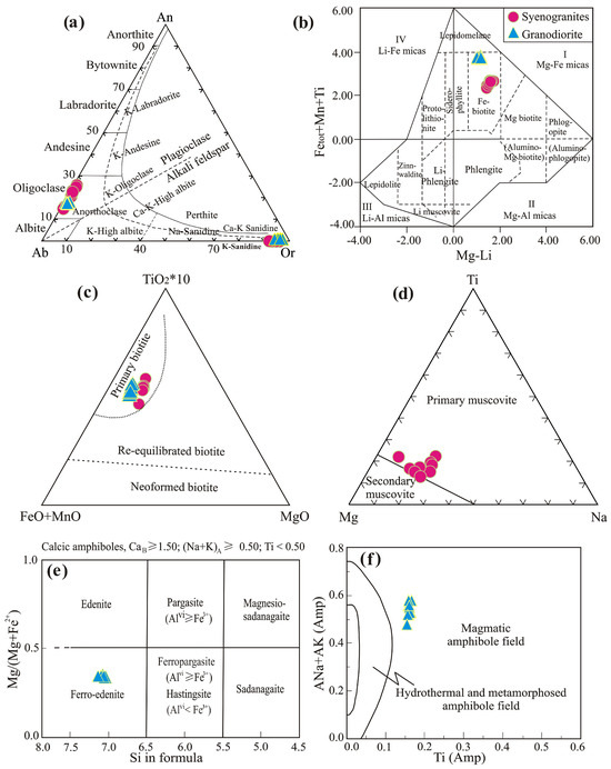 Mineral chemistry of silicate minerals in the studied granites. (a) Ab-An-Or ternary classification diagram indicating feldspar composition. (b) Classification diagram of biotite [13]. (c) (FeOt + MnO) − 10 * TiO2 − MgO ternary diagram discriminating between primary, re-equilibrated, and secondary biotite [14]. (d) Mg–Ti–Na ternary diagrams discriminating between primary and secondary muscovite [15]. (e) Si vs. Mg/Mg + Fe + 2 binary diagram for amphiboles nomenclature [16]. (f) Ti vs. (Na + K) discrimination diagram of the studied amphiboles [17].