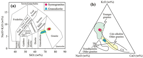 The representative whole rock geochemical data of 20 samples are presented in Supplementary Table S2. Based on the SiO2 content of the investigated granitic rocks, it is obvious that a small compositional gap is observed between granodiorites (66.04–69.31 wt%) and syenogranites (72.02–74.02 wt%). Syenogranites have higher K2O (4.24–4.4 wt%) and lower Al2O3 (13.79–14.25 wt%), Fe2O3 (1.96–2.36 wt%), MgO (0.21–0.44 wt%), and Na2O (3.57–3.62 wt%) relative to granodiorites (K2O = 2.45–2.7 wt%; Al2O3 = 14.78–16.03 wt%); Fe2O3 = 3.09–4.65 wt%; MgO = 1.27–1.94 wt%; Na2O = 4.05–4.24 wt%). According to the TAS classification diagram, syenogranites are plotted in the granite field, while granodiorites fall as expected in the granodiorite field (Figure 5a). This is generally consistent with petrographic investigations. The Na2O–K2O–CaO ternary diagram suggested by Hassan and Hashad [18] provides good separation of the Egyptian granitic rocks (Figure 5b). It shows that the investigated syenogranites are in harmony with Egyptian younger granites while granodiorites are comparable with Egyptian calc-alkaline older granitic rocks (Figure 5b). The total alkalis (Na2O + K2O = 6.5–8.01 wt.%) and differentiation index (D.I. = 71.9–90.15) (Supplementary Table S2) are comparable with ANS granites.