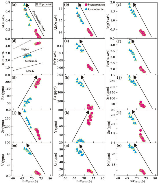 Harker variation diagrams were plotted to indicate the relation between SiO2 content and selected major and trace elements in the investigated granitic rocks. They show higher concentrations of TiO2, Al2O3, MgO, P2O5, FeOt, Ba, Sr, Zr, and Cr and lower abundances of K2O, Rb, and Y in granodiorites relative to syenogranites (Figure 6). Most elements of the investigated granitic rocks (TiO2, Al2O3, MgO, P2O5, FeOt, Ba, Sr, Zr, Sc, V, Cr and Ni) show a linear decrease with increasing SiO2, except K2O, Rb and Y, which are positively correlated (Figure 6).