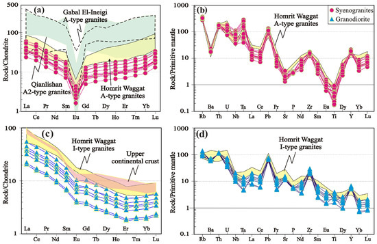Trace element-normalized patterns of syenogranites and granodiorites analyses (Figure 7b,d) show clearly different patterns. Syenogranites display negative anomalies of Sr, Ba, P, and Ti and enrichment in K, Rb, Th, Ta, and Nb (Figure 7b) similar to Homrit Waggat post-tectonic (A-type) granites [24]. On the other hand, granodiorites are enriched in large ion lithophile elements (LILE = Sr, K, Rb, Ba) relative to high-field-strength elements (HFSE = Ta, Nb, Zr, Ti) (Figure 7d) similar to Homrit Waggat syn-tectonic granites [24].
