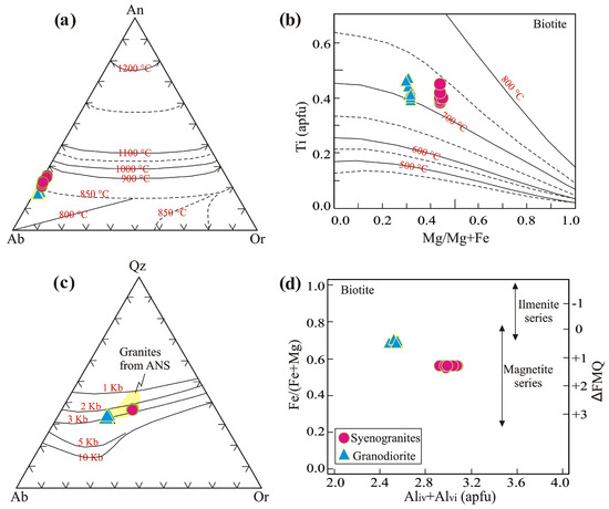 Crystallization conditions (P–T–fO2) of the studied granites. (a) Ab–An–Or thermometry diagram [28]. (b) Ti vs. Mg/(Mg + Fe) for the analyzed biotite showing temperature isotherms [30]. (c) Ab–Qz–Or ternary diagram for the studied granitic rocks [31]. (d) Fe/(Fe + Mg) vs. AlIV + AlVI for the analyzed biotite. Ilmenite and magnetite series after Anderson et al. [32].