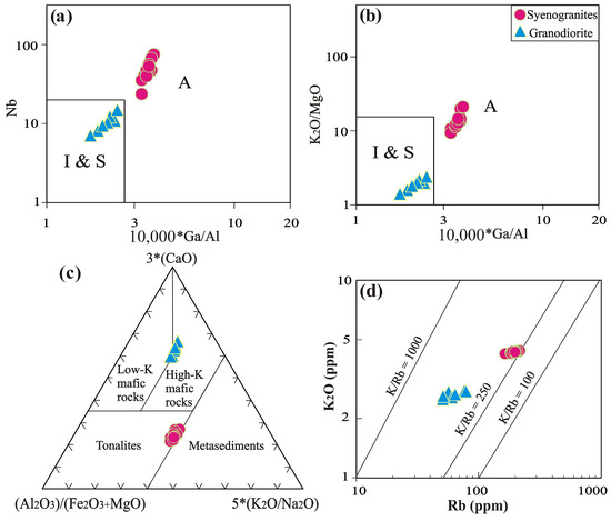 Bulk-rock chemistry showing different types and sources of the studied granites. (a,b) 104 × Ga/Al against Nb and K2O/MgO for distinguishing between I, S, M and A-type granites [40]. (c) Al2O3/(FeOt + MgO) − 3*CaO − 5*(K2O/Na2O) ternary diagram [41]. (d) Rb vs. K2O diagram [44].