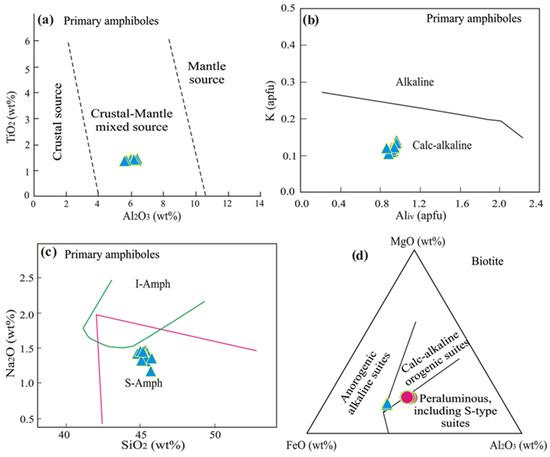 Mineral chemistry of amphiboles and biotite from the studied granites. (a) TiO2 vs Al2O3 for the studied primary amphiboles [72]. (b) Cations of Aliv vs. K binary diagram discriminating between alkaline and calc-alkaline magma [71]. (c) SiO2 vs. Na2O binary diagram of amphiboles [73] (I-Amph = within-plate amphiboles; S-Amph = Supra-subduction amphiboles). (d) FeO-MgO-Al2O3 ternary discrimination diagram of biotite [70].