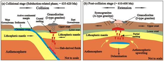 According to the above discussion, we can conclude that Mount Abu Kibash and Tulayah granites (granodiorites and syenogranites) were formed during two different stages during the transition from collisional stage (volcanic arc) to post-collisional stage (extensional environment). The intrusion of granitic rocks in the studied area commenced with the emplacement of calc-alkaline I-type granodiorites in a volcanic arc setting during the accretion of a volcanic arc system onto the East Gondwana margin during the evolution of the juvenile ANS crust (Figure 13). Granodiorites parent melts were generated by hydrous partial melting of the mantle wedge as a result of slab dehydration (Figure 13a). This yielded a primary basic magma that moved upward and came into contact with the lower crust (Figure 13a), with the high temperature of the generated basic melt increasing the continental geotherm and thereby resulting in melting of the lower crust to form intermediate magma. This is in agreement with many previous studies which state that subduction-related granitic rocks are mostly the product of melting of basaltic/gabbroic magmas that pond and crystallize at the base of the crust [24,26,74]. The resultant melts fractionated during their ascent in the upper crust to form the investigated I-type granodiorites. This interpretation is supported by the Rb vs. K/Rb diagram (Figure 9a) that shows that the studied granodiorites follow assimilation and fractional crystallization trends. The transition from a subduction stage to an extensional setting took place in the ANS at 600 ± 10 Ma [75] and was accompanied by the intrusion of late to post-collisional Egyptian younger granites like the studied syenogranites (Figure 13b). The emplacement of syenogranites (A-type) happened after crustal thickening and the lithospheric delamination that took place after a slab break-off event [76] (Figure 13b). The last event was accompanied by high thermal anomaly resulting from upwelling of hot asthenosphere during lithospheric delamination [77]. Upwelling of asthenospheric melts and their underplating caused fertilization (enrichment in HFSEs and alkalis; Figure 7b and Figure 13b) of the lithosphere before partial melting. This is in agreement with Martin [78] who stated that the upwelling of the asthenospheric mantle below areas subjected to extension causes mantle degassing and subsequent melting, whereby the released fluids are alkali and silica bearing and can transport a variety of elements like HFSEs and metasomatize the upper mantle and the lower to middle crust. The high temperature asthenospheric melts promoted partial melting of preexisting tonalites in the lower crust (Figure 10c) to generate the post-collisional, peraluminous magmas that eventually crystallize the investigated syenogranites (A-type granites). Fractionation of these crustal melts took place during their ascent and before their crystallization in the upper crust to form evolved granites like the studied syenogranites (Figure 9 and Figure 11b). Therefore, the syenogranites intruded into and post-date the granodiorites (Figure 13b). The suggested post-orogenic regime for syenogranites (A-type) is also in agreement with many workers (e.g., [8,24]) who agree that the A-type granites were emplaced in an extensional setting related to the post-collisional collapse of the Pan-African Orogeny. The transition from a compressional to an extensional setting is dominated in the ANS at 600 ± 10 Ma [75] and was accompanied by crustal uplifting, thickening, and extensional collapse of the ANS continental crust (Figure 13b), leading to emplacement of large masses of A-type granites at the end of Pan-African orogenic event [12]. So, this transition represents an episode of strong magmatic activity (A-type granites) during the evolution of the ANS.