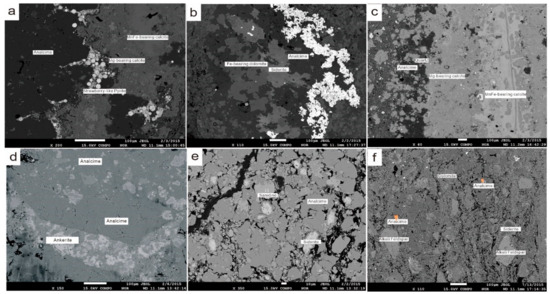 The analcite is commonly associated with minerals such as quartz, dolomite, calcite, K-feldspar, and alkali feldspar. Analcite grains often contain feldspar and quartz grains (Figure 3m,t), indicating that the formation time of analcite is synchronous with or later than the formation of feldspar, quartz, and other volcaniclastic materials Pyrite is also one of the accompanying minerals, and it often presents special morphologies such as berry-like and needle-like shapes, with obvious biogenic morphologies, growing around the analcite or in a zonal pattern with analcite, iron-manganese calcite, and iron-bearing dolomite (Figure 4a,b). Analcite is also commonly associated with carbonate minerals, and the carbonates often exhibit abnormally high interference colors, typically being magnesium-, iron-, and manganese-rich carbonate minerals, such as magnesite, magnesium-rich calcite, manganese-rich calcite, and ankerite (Figure 4b–d). In addition, intergrowth of analcite with plagioclase can also be observed (Figure 4e). In some samples, analcite is also found to coexist with alkali feldspar, with the alkali feldspar exhibiting a “phenocrystic” appearance on a microcrystalline dolomite base, which may be due to turbidite deposition (Figure 4f).