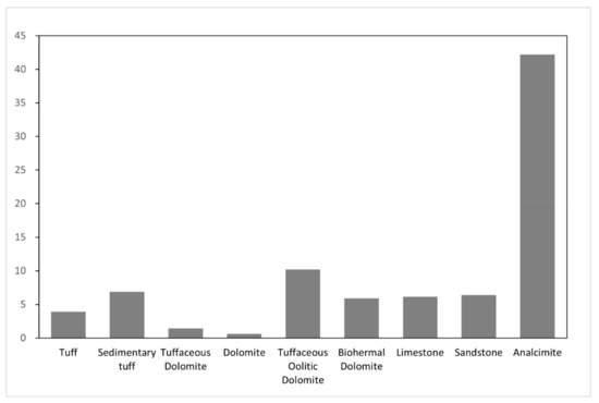 According to the X-ray diffraction results (Table 1), the content of analcite in different rock types is as follows: