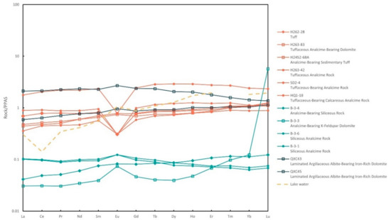 Figure 6 illustrates a comparison of rare earth elements among the three locations. The δEuN of the samples from the study area exhibits a clear bimodality, a feature not observed in the other two regions. The dolomites from all three areas show a slight positive Eu anomaly, which is considered a typical characteristic of hydrothermal sedimentary rocks [39]. The negative Eu anomaly in the tuff and analcite rocks from the study area reflects a magmatic stage that has undergone plagioclase crystallization separation, possibly related to acidic magma or silica-rich post-magmatic fluids. The δCeN of the samples from the study area shows a significant positive anomaly, while the other two regions show no significant depletion or enrichment, which may reflect differences in sedimentary and diagenetic environments. During the sedimentation and diagenesis processes in the study area, the water body was relatively rich in Mn, reducing Ce4+ into the water body, resulting in a positive anomaly. The presence of a large amount of high-manganese calcite and dolomite in the study area confirms this sedimentary environment, which also serves as evidence that the lake bottom was a hot brine environment with strong reducing and alkaline conditions [47,48]. Figure 8 shows that the ∑REE is well correlated with Ce/δCeN and that the Ce/δCeN is well correlated with Eu/δEuN. This indicates that the samples arecontrolled by diagenetic processes which may also have affected the Ce anomaly and the overall enrichment of REEs in the sample SD2-4.