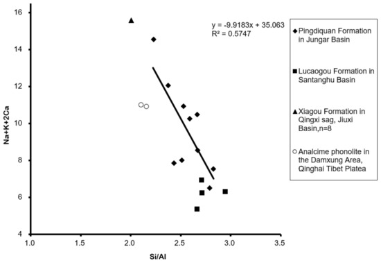 By comparing and analyzing the compositional content of analcite in the study area with that in hydrothermal sedimentary rocks from the Lucaogou Formation of the Santanghu Basin in Xinjiang, the Xiagou Formation of the Qingxi Depression in the Jiuxi Basin in Gansu, and the analcite phonolite from the Dangxiong area of Tibet [27,30,44,46] (Figure 7), it can be observed that the analcite in the study area generally shares a consistent correlation with the analcite in the other two hydrothermal sedimentary rocks. The content of alkali metal ions falls between that of the analcite in the Lucaogou Formation of the Santanghu Basin and the Xiagou Formation of the Qingxi Depression, and is closer to that of the analcite in the Dangxiong area. A notable point is that the analcite in the study area has a higher FeO content compared to the analcite from the other two regions, suggesting a greater influence from magmatic-hydrothermal activities. Furthermore, through plotting, we have found that the Si/Al ratio in the study area exhibits a strong negative correlation with the content of alkali metal ions Na, K, and Ca. A lower silicon content indicates a higher content of alkali metal ions, which also implies that the analcite may originate from an environment richer in alkali metal ions.