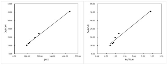 Correlation plots of Ce/δCeN with ∑REE and Ce/δCeN with Eu/δEuN for analcite-bearing rock samples in the study area.
