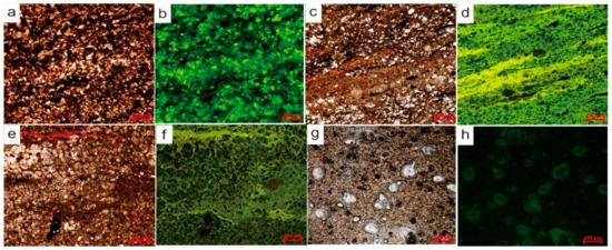 The results from the observation of fluorescent thin sections indicate that under the excitation of a blue light source, the laminated hydrocarbon source rocks of the Pinglequan Formation exhibit strong fluorescence (Figure 9). Notably, the laminations with higher analcime content display a more intense yellow fluorescence, which suggests a robust oil-generating potential and a relatively low degree of organic matter maturation. In conjunction with the organic geochemical studies conducted by other researchers on the hydrocarbon source rocks, it is evident that rocks containing analcime possess a strong capacity for hydrocarbon generation. Moreover, the organic matter is predominantly derived from aquatic algae, with a portion also attributable to bacteria and terrestrial plants, albeit in smaller proportions for the latter [50].