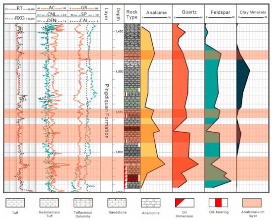 The samples mainly come from the Pingdiquan Formation drill cores in the Huoshaoshan area of the Xinjiang Oilfield. Key wells H262, H263, and H2452 exhibit well-developed Pingdiquan Formation strata, which have not been affected by tectonic activity leading to loss of strata. Key wells SD1, SD2, and HQ1 have distinct analcite rock layers, making them special compared to other wells. In the rock and mineral testing section, Sections of the cores from the aforementioned key wells are ground and observed at approximately 0.5 m intervals to clarify the types of rocks in the Pingdiquan Formation. Electron probe sections are prepared for layers with well-developed laminations to observe the characteristics of analcite. The electron probe tests were completed in the electron probe laboratory of the Xi’an Geological Survey Center of the China Geological Survey. The instrument used was a JEOL JXA-8230 from Japan (JEOL, Tokyo, Japan). The experiment voltage was 15 kV, the test current was 1′10-8A, and the beam spot diameter was 1–5 mm. The correction method was ZAF, following the standard GB/T 115074-2008 [19]. Randomly selected rock types from the key wells are subjected to X-ray diffraction analysis. They were sent to the Laboratory Testing Center of the Xi’an Geological Survey Center for X-ray diffraction (XRD) analysis. The instrument model used was D/max-2500 (Rigaku, Tokyo, Japan), with parameters set at 40 kV and 200 mA, a scanning step size of 0.020°, a speed of 10°/min, and a range of 5–56°. The DS and SS were set to 1°, and the RS was 0.15 mm. Rare Earth Element Analysis Section: Based on the X-ray diffraction results, rock samples with higher contents of analcite and dolomite are selected for rare earth element analysis. They are conducted at the State Key Laboratory of Continental Dynamics, Northwest University, using a solution method. The instrument model used was an ELAN6100DRC (Perkin Elmer, Waltham, MA, USA) inductively coupled plasma mass spectrometer (ICP-MS). Oil and Gas Evaluation Section: Thin sections from the key wells are observed using a fluorescence polarizing microscope in the Department of Geology, Northwest University. The instrument model used was an Axio Scope. A1 (ZEISS, Oberkochen, Germany). To explore the vertical distribution of analcite and its correlation with oil and gas, field core inspections are combined with well logging data from the Xinjiang Oilfield, Karamay, China. Since well H262 has a well-developed Pingdiquan Formation overall and sufficient oil and gas data, a single-well analysis of mineralogy, phillipsite content, and oil and gas enrichment is conducted for well H262.