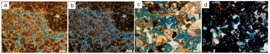 The mineral composition in the tuff is predominantly characterized by felsic fragments, with plagioclase, orthoclase, and a small amount of sanidine being the main feldspars. The grain size ranges from approximately 0.01 to 0.1 mm, with some grains exhibiting bay-like and fragmented edges, indicative of a typical tuffaceous texture. Additionally, a significant amount of vitroclastic tuff is observed, where the shards and crystal fragments are irregularly shaped, such as torn and flame-like forms, and in some rocks, they are cemented in a “matrix” manner (Figure 3a,b).