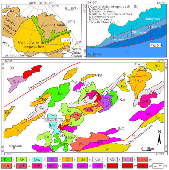 The Central Asian orogenic belt is a typical accretion-type orogenic belt located between the Eastern European Craton, Siberian Craton, Tarim Craton, and North China Craton (Figure 1a) [1,2,3,4,5]. Previous studies have shown that multi-ocean basins, multi-subduction zones, and multi-directional convergence are important mechanisms for continental accretion in this belt [6,7]. It is characterized by extensive accretion and collage of continental and oceanic crustal fragments, accretionary complexes, magmatic arcs, ophiolites and other geological bodies [8,9]. From the Paleozoic to the Mesozoic, this belt experienced complex tectonic history marked by the closure of the several Paleo-Asian oceanic branches (including the Hegenshan, Okhotsk, and Solonker oceanic basin) and collage of a number of continental fragments (such as Xilinhot microcontinental block, Xing’an block) and intra-oceanic arcs to the North China Craton [10,11,12,13,14,15,16,17,18,19], with the formation of suture zones such as Hegenshan, Diyanmiao, and Solonker (Figure 1b). The Hegenshan suture zone, specifically, emerged in the eastern-northern portion of the Central Asian orogenic belt through subduction and collision processes involving the Xing’an block and Xilinhot microcontinental block [20,21,22,23,24,25,26,27].