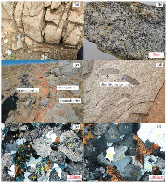 Field and microscopic photographs of the quartz diorite in Uhelchulu and granodiorite in Guiqinkundui. (a,b) field photos of Uhelchulu quartz diorite; (c,d) field photos of Guiqinkundui granodiorite; (e) Uhelchulu quartz diorite with hypidiomorphic crystal (crossed polarizers); (f) Guiqinkundui granodiorite hypidiomorphic crystal (crossed polarizers).