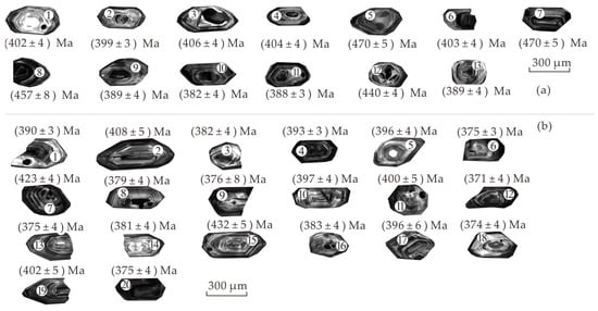 Zircon grains extracted from the Uhelchulu quartz diorite and Guiqinkundui granodiorite exhibit a characteristic pink-yellow color and display well-defined morphologies, predominantly prismatic to short prismatic shaped crystal. The grains range in size from approximately 205 to 330 μm in length and 20 to 96 μm in width, with aspect ratios varying between 2:1 and 3:1. Cathodoluminescence (CL) imaging reveals the presence of oscillatory zoning patterns within the zircon (Figure 3a,b), indicative of a magmatic origin. These patterns are characterized by distinct rhythmic zoning structures with minimal visible residual cores. Secondary fractures are relatively limited, and the Th/U ratios of the zircon consistently exceed 0.1 (Th/U = 0.12–0.96), further corroborating a magmatic origin for the zircon grains. The results of LA-ICP-MS zircon U-Pb dating for the Uhelchulu quartz diorite and Guiqinkundui granodiorite are shown in Table 1 and Table 2, respectively.