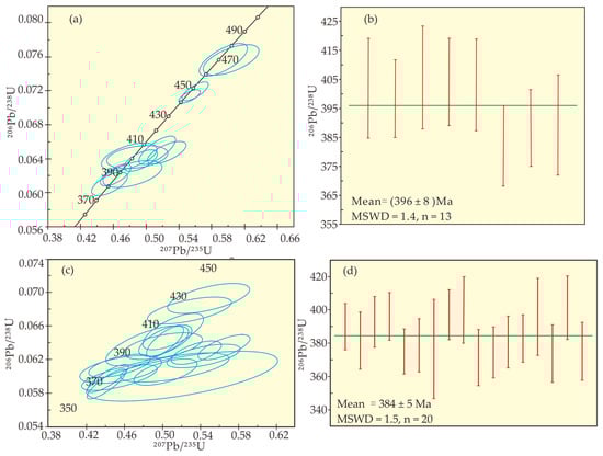 The Uhelchulu quartz diorite exhibits a consistent 206Pb/238U age distribution across all zircon grains, with the exception of those at measurement points 5, 7, 8, and 12. These latter grains may represent inherited zircon incorporated during magmatic processes. The remaining 206Pb/238U age values range from 381 to 405 Ma, clustering along the concordia line (Figure 4a). The weighted average age of 13 206Pb/238U measurements is (395 ± 8) Ma (MSWD = 1.4), suggesting that the Uhelchulu quartz diorite crystallized during the Early Devonian (Figure 4b). Similarly, all 20 zircon grains analyzed from the Guiqinkundui granodiorite exhibit a relatively homogeneous distribution of 206Pb/238U age values, ranging from 371 to 431 Ma, clustering along the concordia line (Figure 4c). The weighted average age of 20 206Pb/238U measurements is (384 ± 5) Ma (MSWD = 1.5) (Figure 4d), indicating that the Guiqinkundui granodiorite formed during the Middle Devonian.