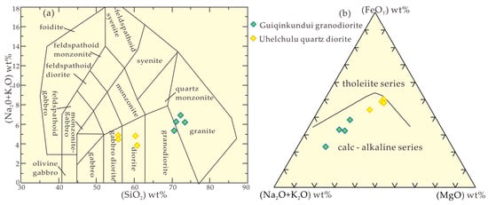 TAS and AFM diagram of quartz diorite-granodiorite from Uhelchulu to Guiqinkundui in Xiwuqi ((a) after E.A.K.Middlemost, 1994 [50]; (b) after Irvine T. N., et al. 1971 [51]).