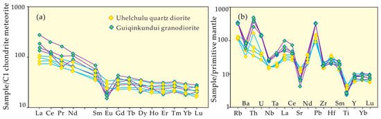 (a) Chondrite-normalized REE distribution patterns (after Boynton, 1984 [52]) and (b) Primitive mantle-normalized trace elements distribution patterns (after Sun and McDonough, 1989 [53]) for the Uhelchulu quartz diorite and Guiqinkundui granodiorite, Xiwuqi.