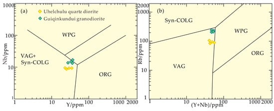 Discrimination diagrams for Uhelchulu quartz diorite and Guiqinkundui granodiorite in Xiwuqi, (a) Y-Nb and (b) (Y + Nb)-Rb (after Pearce et al., 1984 [69]). Syn-COLG (syn-collision granite); WPG (within plate granite); VAG (volcanic arc granite); and ORG (mid ocean ridge granite).