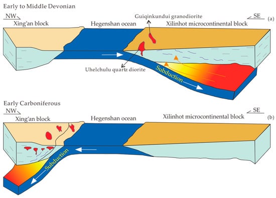 Petrological and geochemical analyses of the Uhelchulu quartz diorite and Guiqinkundui granodiorite indicate that the Xiwuqi area occupied an active continental margin arc setting within the Xilinhot microcontinental block during the Early to Middle Devonian. This interpretation suggests that the Hegenshan oceanic crust underwent southward subduction during this period (Figure 9a). Previous research has suggested that the Hegenshan ocean transitioned to northward subduction at least during the Early Carboniferous (Figure 9b). Therefore, we preliminarily believed that the Hegenshan ocean may might have undergone a shift in subduction mechanism during the Late Devonian or Early Carboniferous.