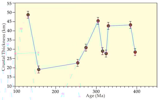 Profeta et al. (2016) proposed a fitting relationship between the whole-rock chemistry (La/Yb)N of intrusions and crustal thickness: H = 21.277ln(1.0204w(La)N/w(Yb)N), Where H is the thickness of the crust and w(La)N/w(Yb)N is the ratio after homogenization of chondrite meteorite [70]. This calculation needs to remove the samples that do not meet the requirements, such as La > 1 × 10−6, Th/U < 0.1, and SiO2 > 75% in the whole-rock chemistry [71,72]. We calculated the variation in crustal thickness from the Early Devonian to Early Cretaceous in the research area (Figure 10) based on the data from this paper and other researchers (Table 4) [30,36,39,73,74,75,76,77]. The crustal thickness in the Early Devonian is relatively thin (~28.52 km), but it increased to 43.13 km during the Middle Devonian. The crustal thickening might continue until the Middle Carboniferous (~42.60 km), which might be related to the continuous southward subduction of the Hegenshan ocean. In the late Early Carboniferous, there was a sudden thinning of the crust, which might be related to the shift in the subduction mechanism of the Hegenshan ocean in the Early Carboniferous. This calculation result might further support the understanding of our study. Subsequently, it underwent crustal thickening and thinning processes several times until the Early Cretaceous in the research region, which is consistent with the geological evolution processes studied by previous researchers.