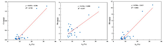 Through the correlation analysis between ash yield and different elemental contents, it was found that Cs, Mo, Rb, Cu, V, U, and other elements in the two high-ash content samples occur inorganic minerals. These elements of the other 14 samples are positively correlated to ash yield. The correlation plots are shown in Figure 16, indicating that the elements largely occur in organic matter. Therefore, most of these elements occur both in organic and inorganic matter.