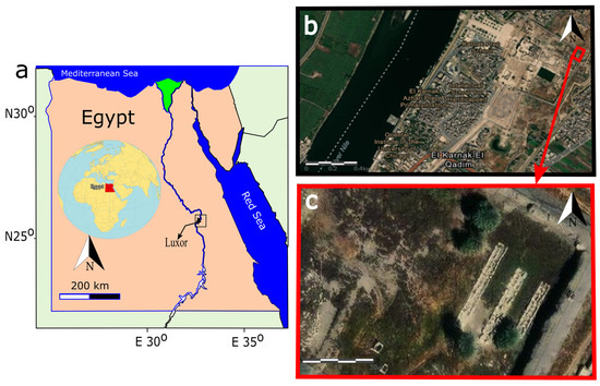 The Temples of Karnak are situated in the upper area of Egypt/Luxor city with the coordinates N 25°43′7″, E 32°39′31″ (Figure 1a,b). The total area of Karnak is around 279.48 km2 and the total area of the case study in the northeast corner of the Karnak Temples is around 3.6 km2 (Figure 1c). The case study is located around 200 m from the surrounding village of Karnak and around 1 km from the Nile River (Figure 1c). This complex is located on the eastern bank of the Nile River and it is considered an enormous open-air museum and the biggest ancient Egyptian religious community globally.