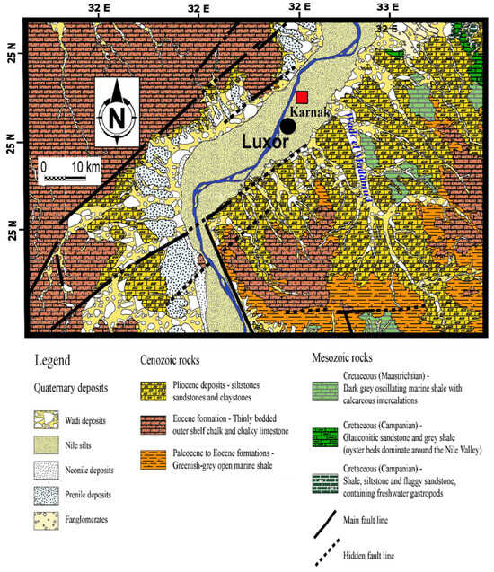 Geological features of middle and upper Egypt date back to the Eocene age from sedimentary formations (sandstones/siltstone and chalky limestones) with low relief topography (Figure 2) [42]. Luxor geology comprises various units that go back to the Upper Cretaceous, Paleocene–Eocene, Pliocene, and Pleistocene-Holocene [43]. The Pliocene unit is composed of Paleonile river sediments (intraformational conglomerate, red-brown clays with thin fine-grained sand and silt laminae). The Pleistocene unit consists of the Protonile sediments from the Early Pleistocene (pebbly and bouldery gravels), the Prenile sediments of the Middle Pleistocene (fluvial sands with minor gravel and clay beds and loosely consolidated gravel of polygenetic origin), and the Neonile sediments of the Late Pleistocene age (Figure 2). The Holocene unit is formed by the Neonile sediments (silt, micaceous sand, and clays) [43]. The Upper Cretaceous–Early Eocene rock units are unconformably overlain by the Pliocene–Holocene units stratigraphically [44]. The main geological setting of the Karnak Temples is Nile Holocene silty clay along with younger alluvial plains (Figure 2). In addition, the elevation of the Theban plateau is around 300 m above sea level with a sharp scarp encountering the Nile valley on its eastern side (Figure 3) [42]. Around 3.17 km from Karnak in new Luxor city, the soil was characterized by [44]. The mineralogical analysis confirmed that the soil contains smectite minerals as major clay minerals and other clay minerals are present as well, such as kaolinite, chlorite, and illite. In this sense, the presence of such clay minerals can cause a lot of damage to the monuments, bearing soil, foundations, and structural elements because of swelling and shrinkage behaviors.