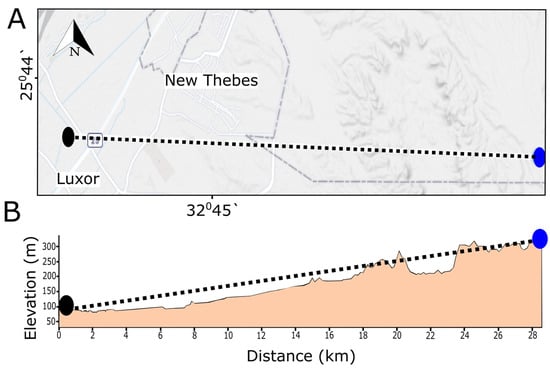 (A) Base map and (B) elevation profile showing the elevation levels of carbonate formations in the Theban area. The black circle marks a point within the Karnak Temples and the blue circle marks a point approximately 28 km to the east.