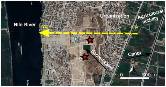 Various contaminated water sources in and around the Temples of Karnak. The yellow arrows indicate the flow direction of water from east to west, originating from canals, drains, cultivated lands, and houses. Salt-contaminated aquifers beneath the Temples of Karnak are marked with stars [53].